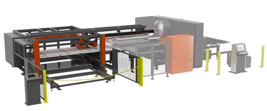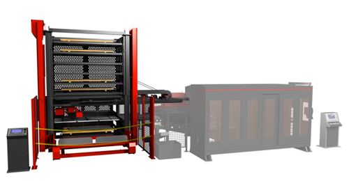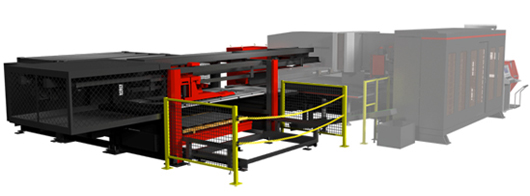 支持長時間自動運轉的材料供給、產品堆垛的系統。將材料的單張取板、搬入、加工后產品的搬出及堆垛操作自動化。加工機的前側為開放空間,能夠方便切換至加工機本體的手動加工。