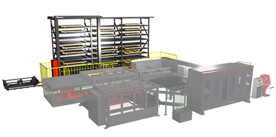 支持24小時運轉的自動倉庫MARS實現了材料及產品的收納、搬運、管理的高效自動化,與鈑金加工柔性生產線聯動,實現工廠的長時間運轉。還能根據工廠的空間自由地設計料架(托架)的層數、列數、出入庫工位的配置等。
